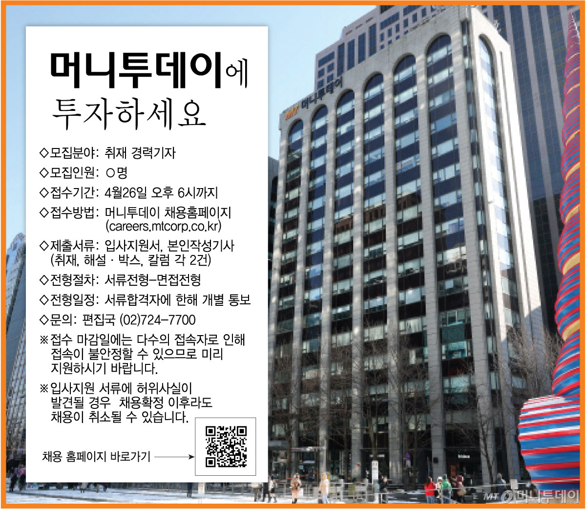 '광화문시대'를 여는 머니투데이의 새로운 여정에 함께 할 경력기자를 모집합니다. '겸손한 자세로 치열한 탐색과 학습을 통해 혁신을 선도할 인재'가 머니투데이가 찾는 기자상입니다. 이런 동료 기자들에게 자신있게 권합니다.