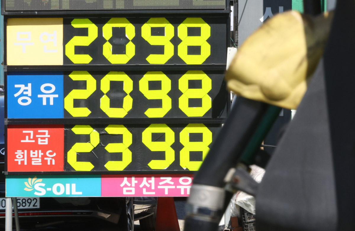 ![[서울=뉴시스] 황준선 기자 = 중동 전쟁 여파로 국제유가가 치솟으면서 서울 주유소 평균 휘발유 가격이 2천 원을 돌파한 7일 서울 시내 한 주유소에 유가 정보가 게시돼 있다. 2026.04.07. hwang@newsis.com /사진=황준선](https://thumb.mt.co.kr/cdn-cgi/image/f=avif/21/2026/04/2026040919441250954_1.jpg)