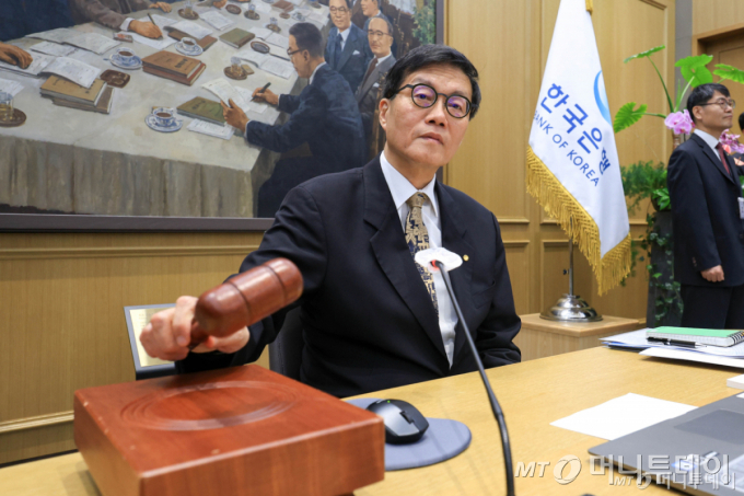[서울=뉴시스] 사진공동취재단 = 이창용 한국은행 총재가 10일 서울 중구 한국은행 본관에서 열린 금융통화위원회 본회의에서 의사봉을 두드리고 있다. 2026.04.10.
