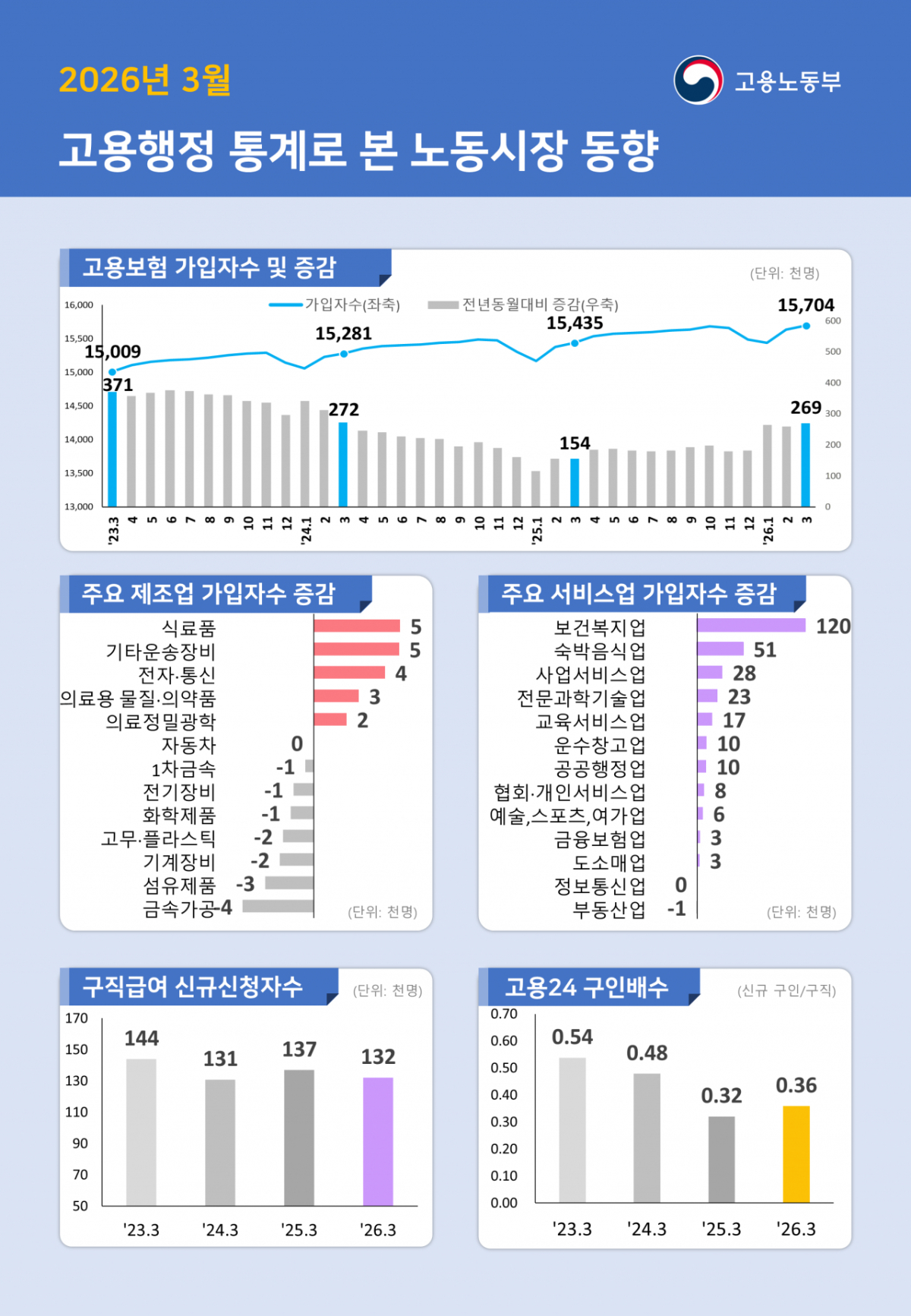 3월 고용보험 상시가입자 수가 전년 대비 26만9000명 증가하며 최근 3개월 연속 20만명대 증가세인 것으로 나타냈다. 지난해 월평균 10만명대 증가세 대비 고용지표 개선이 이어지는 중이다. 서비스업 중심으로 일자리가 늘어난 반면 제조업과 건설업에서 근로자 수 감소는 지속됐다.