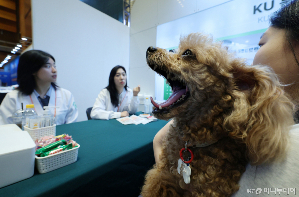 ![[서울=뉴시스] 이영환 기자 = 13일 오전 서울 강남구 코엑스에서 열린 2025 케이펫페어 건국대학교 동물병원 부스에서 반려견이 상담을 받으며 하품을 하고 있다. 2025.08.13. 20hwan@newsis.com /사진=이영환](https://thumb.mt.co.kr/cdn-cgi/image/f=avif/21/2026/04/2026041314432487506_1.jpg)