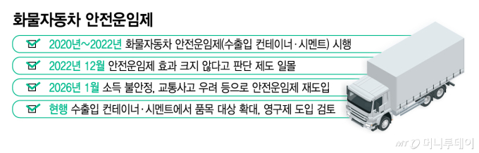 제도는 2020년 도입돼 2022년까지 3년간 한시적으로 시행된 뒤 일몰됐다. 이후 제도 일몰을 둘러싸고 갈등이 격화되면서 같은 해 민주노총 화물연대가 총파업에 돌입하는 등 물류 차질이 발생하기도 했다. 산업 전반으로 파장이 확산하면서 제도 필요성을 둘러싼 논쟁이 이어졌고 결국 화물차주의 소득 불안정과 교통안전 우려 등을 이유로 올 1월 제도가 다시 도입됐다. 현재는 수출입 컨테이너와 시멘트 품목에만 안전운임제가 적용되고 있다.