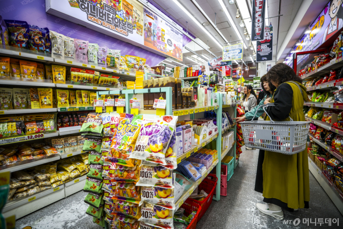 ![[서울=뉴시스] 정병혁 기자 = 3일 서울 중구 명동에 위치한 마트를 찾은 여행객들이 과자, 라면 등 K푸드를 살펴보고 있다. 농림축산식품부는 올해 1분기(1~3월) 케이-푸드플러스(K-푸드+) 수출액이 33억 5000만 달러(잠정)로, 전년 동기 대비 3.5% 증가했다고 밝혔다. 'K-푸드+'는 신선·가공 농식품과 함께 동물용의약품, 농기계, 농약, 비료 등 농산업 전후방 산업을 포괄하는 개념이다. 2026.04.03. jhope@newsis.com /사진=정병혁](https://thumb.mt.co.kr/cdn-cgi/image/f=avif/21/2026/04/2026041511012044046_1.jpg)