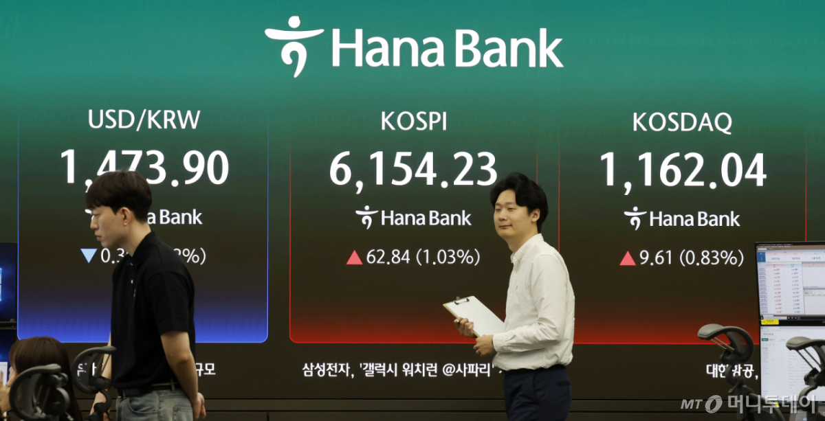 ![[서울=뉴시스] 김혜진 기자 = 코스피가 전 거래일(6091.39)보다 58.10포인트(0.95%) 상승한 6149.49에 개장한 16일 오전 서울 중구 하나은행 딜링룸 전광판에 지수가 표시 되고 있다. 코스닥 지수는 전 거래일(1152.43)보다 10.57포인트(0.92%) 오른 1163.00에 거래를 시작했다. 원·달러 환율은 전 거래일 주간거래 종가(1474.2원)보다 0.6원 내린 1473.6원에 출발했다. 2026.04.16.](https://thumb.mt.co.kr/cdn-cgi/image/f=avif/21/2026/04/2026041615382660379_1.jpg)
