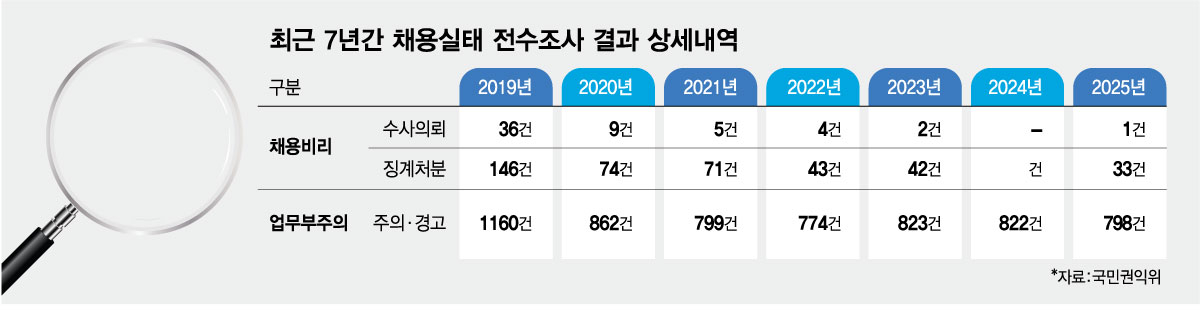 채용계획 수립단계부터 부실하게 설계된 사례도 확인됐다. 특정 지원자에게 유리하도록 공고를 설계하거나 평가과정에서 순위에 영향을 줄 수 있는 방식으로 절차가 운영된 경우도 적지 않았다. 권익위는 이 가운데 1건을 수사의뢰하고 33건에 대해 징계절차를 밟았다.
