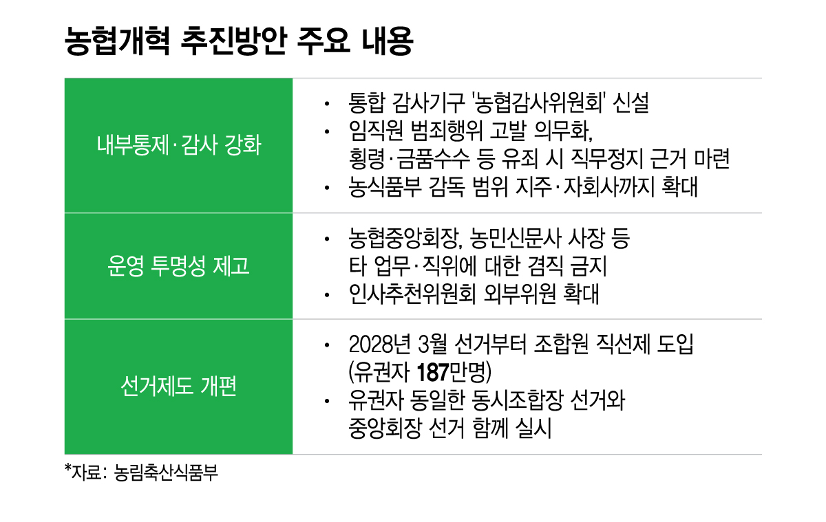 또 "다음 주부터 권역별 설명회를 열어 현장 의견을 충분히 수렴할 예정"이라며 "개혁안의 취지와 구체적인 내용을 충분히 설명하면 일선 조합장들도 함께해줄 것으로 기대한다"고 밝혔다.