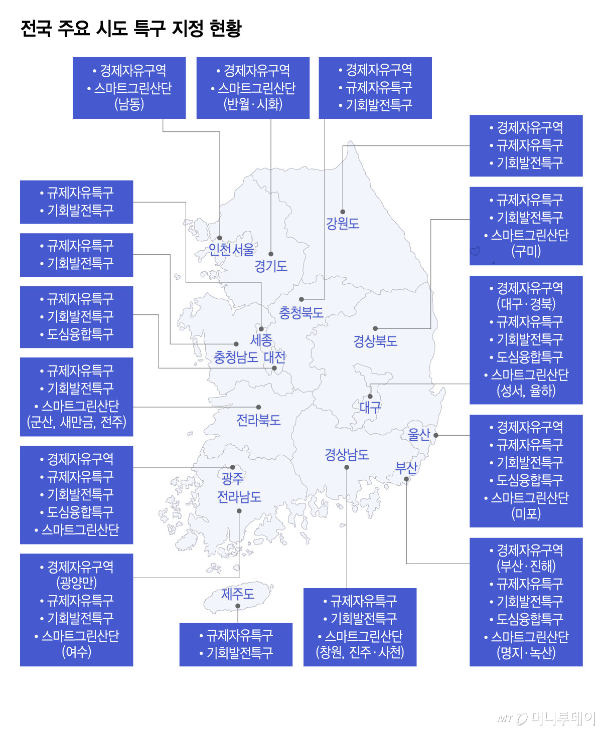 뿐만아니라 각 지자체에서도 자율적으로 농공산단, 일반산단 등을 특구로 지정해 운영할 수 있다. 범부처 컨트롤타워 없이 각 주체마다 특구를 지정하다보니 같은 지역에 중복으로 지정되는 경우가 다반사였던 것이다.