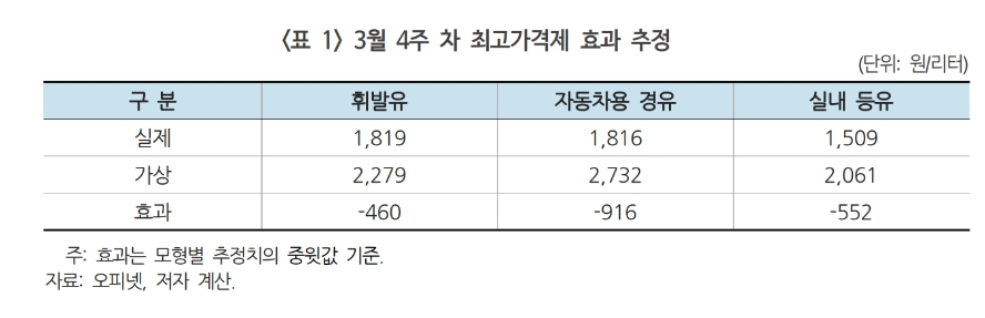KDI는 회귀식을 이용해 최고가격제가 없었을 경우 가상 가격을 추정한 뒤 실제 가격과의 차이를 분석했다. 분석 결과 1차 최고가격제가 적용된 마지막 주인 3월 4주차 소비자가 누린 가격 인하 효과는 리터(ℓ)당 △휘발유 약 460원 △경유 약 916원 △실내등유 약 552원으로 추정됐다.