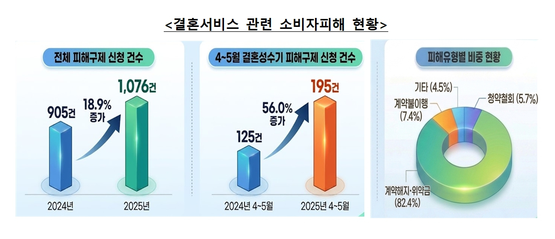 소비자원에 따르면 결혼서비스 관련 소비자 피해구제 신청 건수는 2024년 905건에서 2025년 1076건으로 18.9% 증가했다. 특히 4~5월에는 전년 동기 대비 56%나 급증한 것으로 나타났다.