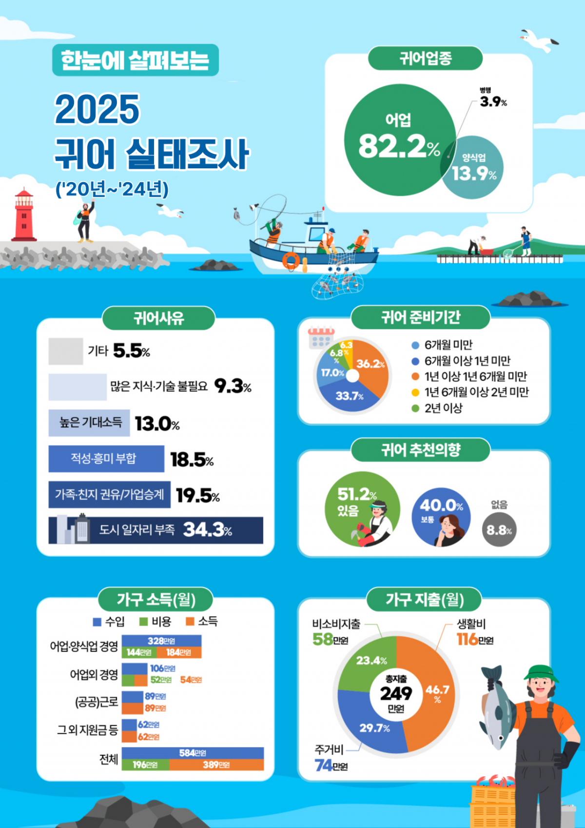 아울러 본인이 현재 종사하고 있는 업종에 대한 만족감(58.9%)이 높았다. 귀어를 추천하는 사람(51.2%)이 2024년 조사(38.8%)에 비해 크게 증가하는 등 귀어 생활에 대한 만족도가 높게 나타났으며 지역 주민과도 원만한 관계를 유지(79.2%)하고 있는 것으로 조사됐다.