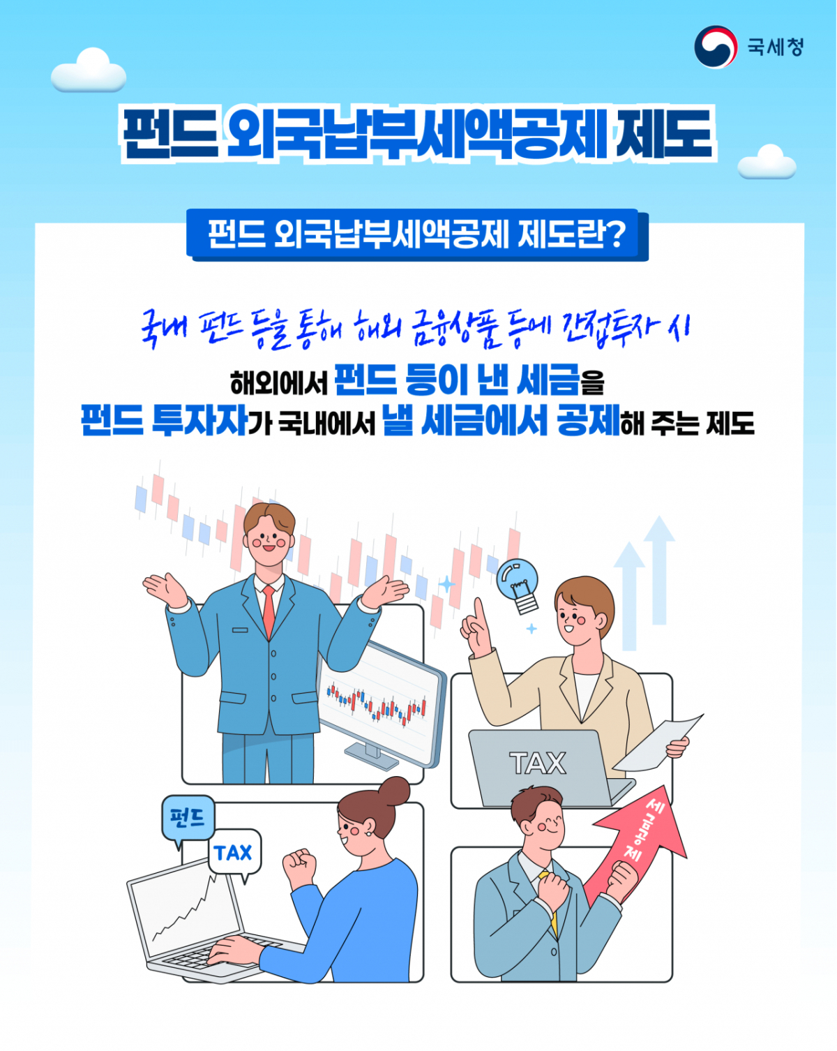 국세청 관계자는 "변경된 방식의 펀드 외국납부세액공제가 올해 처음으로 실시되는 것"이라며 "펀드 투자로 외국에 납부한 세액이 있는 납세자는 올해 5월 종합소득세 신고 시 공제를 신청해 세액공제를 꼭 받길 바란다"고 말했다.