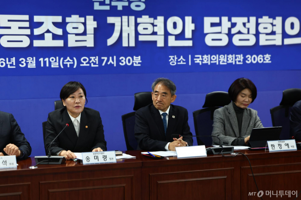 ![[서울=뉴시스] 김명년 기자 = 송미령 농림축산식품부 장관이 11일 오전 서울 여의도 국회 의원회관에서 열린 농업협동조합 개혁안 당정협의에서 모두발언하고 있다. 2026.03.11. kmn@newsis.com /사진=김명년](https://thumb.mt.co.kr/cdn-cgi/image/f=avif/21/2026/04/2026042709520089767_1.jpg)
