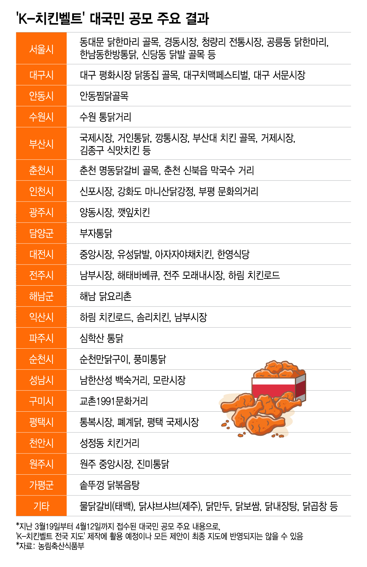 농림축산식품부는 K-치킨벨트 지도 제작을 앞두고 실시한 대국민 참여 이벤트에 총 2704건이 접수됐다고 28일 밝혔다. 지난달 19일부터 이달 12일까지 진행된 이번 공모에선 국민이 직접 지역 맛집과 특화거리를 추천하도록 했다.