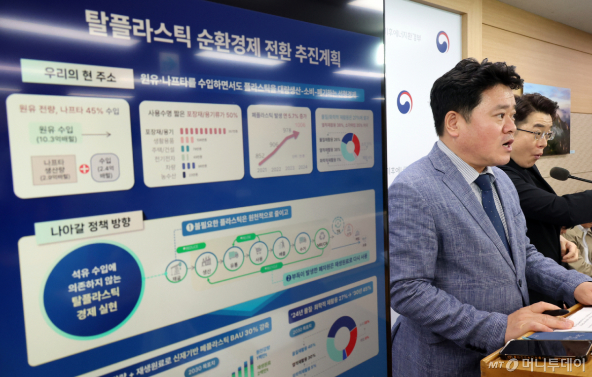 ![[세종=뉴시스] 강종민 기자 = 김고응 기후에너지환경부 자원순환국장이 28일 세종시 정부세종청사에서 탈플라스틱 순환경제 전환 추진계획을 설명하고 있다. 2026.04.28. ppkjm@newsis.com /사진=강종민](https://thumb.mt.co.kr/cdn-cgi/image/f=avif/21/2026/04/2026042815160021879_1.jpg)