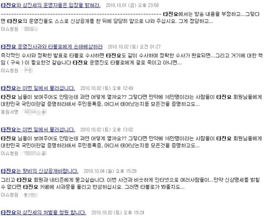 한편 '타진요' 카페 회원은 1일 MBC스페셜 방송 이후 크게 늘어 18만명을 넘었다.