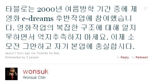 6일 오전 진원석 감독은 자신의 트위터에 영어와 한국어로 "타블로는 2000년 여름방학 기간 중에 제 영화 '이 드림스(e-dreams)' 후반작업에 참여했습니다. 영화 작업의 복잡한 구조에 대해 알지 못하면서 억지추측하지 마세요. 이제 소모전 그만하고 자기 본업에 충실합시다"고 대신 해명했다.