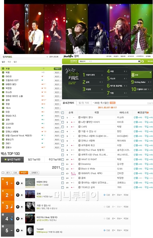 7일 오전 ‘바람이 분다’와 ‘꿈에’는 각각 싸이월드뮤직 1위, 14위에 랭크됐고, 네이버뮤직과 벅스뮤직 1, 2위에 나란히 들기도 했다.