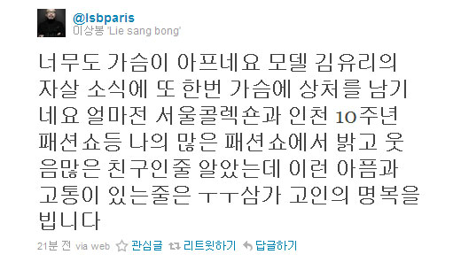이날 오후 이씨는 자신의 트위터에 "너무도 가슴이 아프다"며 "모델 김유리의 자살 소식에 또 한 번 가슴에 상처를 남긴다"고 글을 올렸다.