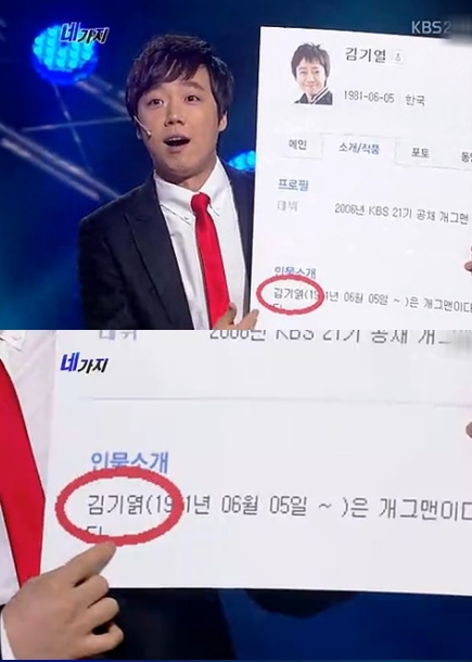 김기열은 11일 밤 방송된 KBS2 '개그콘서트' 코너 '네가지'에 출연해 한 포털사이트에 자신의 프로필 이름이 잘못 기재된 것을 공개했다.