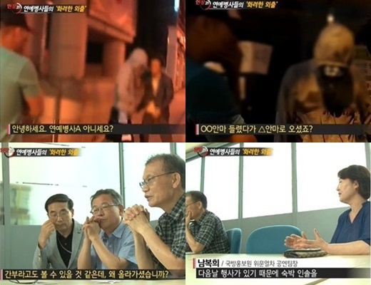 지난 25일 SBS '현장21'이 보도한 연예병사의 실태는 실로 충격적이었다. 이날 방송에서는 강원도 춘천 현지 홍보활동을 마친 연예병사 중 일부가 새벽 시간 안마시술소를 출입하는 모습이 담겼다. 이들은 사복 차림에, 휴대전화를 사용하기도 했다.