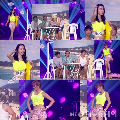 김나희는 '점점점' 코너에 꽃무늬 핫팬츠와 노란색 민소매 티를 짧게 묶은 상의을 입고 무대에 등장해 관객들의 탄성을 자아냈다. 아무 말 없이 주변을 두리번거리다 지나 가는 행인 역임에도 불구하고 볼륨감 넘치는 몸매로 눈길을 사로잡았다.