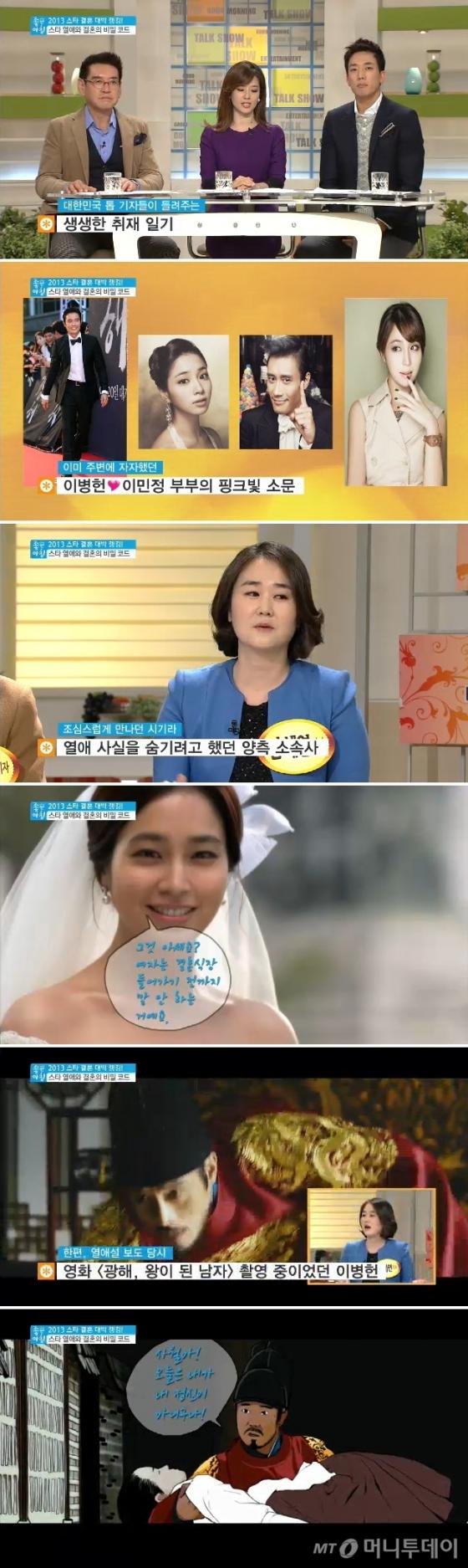 특히 이병헌-이민정 결혼 기사를 최초 보도한 남혜연 기자는 "당시 양측에서 열애설을 부인했었다"고 말했다. 이어 직접 그들을 만났을 때 열애설을 부인했던 이유를 묻자 이민정이 "여자는 결혼식장 들어가기 전까지 말 안하는 거래요"라며 센스있는 답변을 했던 사실을 밝히기도 했다.