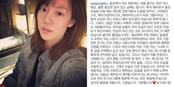 앞서 11일 임수정은 자신의 인스타그램을 통해 민낯 사진을 공개했고 일부 누리꾼들은 악플을 달았다. 이어 지난 14일 임수정은 인스타그램을 통해 또 한장의 민낯 사진을 게재하며 장문의 글을 남겼다.