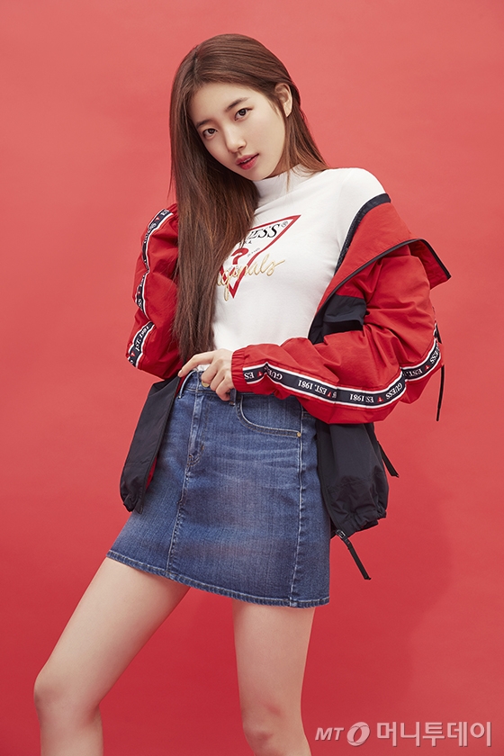 수지는 게스 오리지널스의 로고 라이닝이 돋보이는 레드 점퍼와 데님 아이템을 매치한 모습이다.