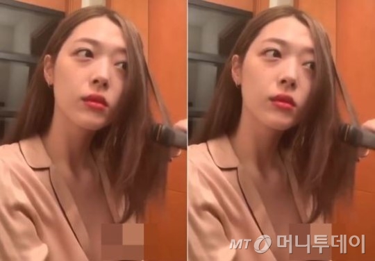 설리는 28일 인스타그램 라이브 방송을 진행하면서 고데기로 머리를 손질하는 자연스러운 모습을 연출했다.