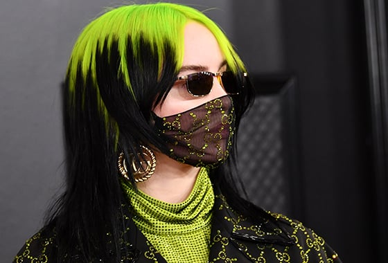 머리 뿌리 부분을 강렬한 네온 그린으로 물들인 빌리 아일리시의 헤어스타일과 긴 스퀘어 모양의 구찌 네일아트는 특히 눈길을 사로잡았다.