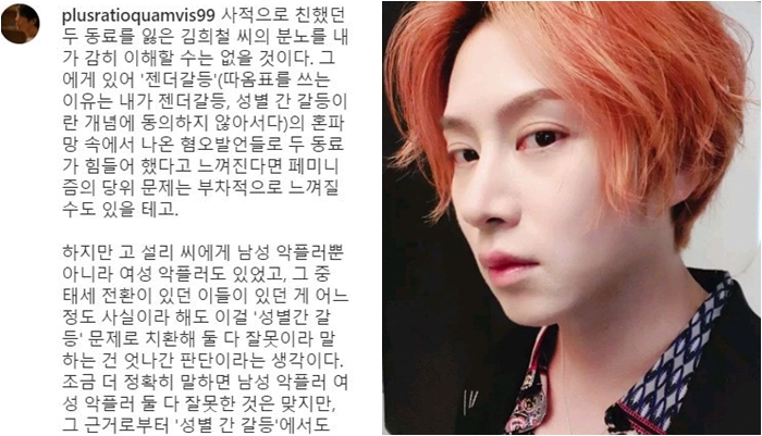 가수 김희철이 세상을 떠난 동료 가수 설리와 구하라를 비난하는 악플러들을 비판하며 "성별을 갈라서 싸운다"고 한 것에 대해 위근우 칼럼니스트가 "남녀 둘 다 잘못이라는 결론을 이끌어낸 것은 논리적 비약"이라고 지적했다. 또 "김희철의 말이 이젠 없는 고인의 진심을 대변하는 게 되어선 안 된다"고 꼬집었다.