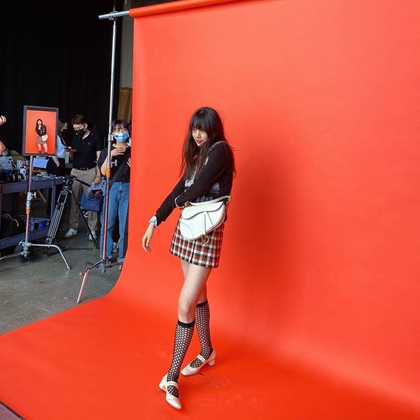 앞서 공개한 또 다른 사진 속에는 수지의 자유분방한 모습이 담겼다. 수지는 체크무늬 미니스커트에 망사스타킹을 신고 포즈를 취하고 있다.