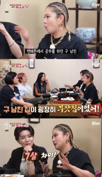 박나래는 "구(舊) 남친이 미국 맨해튼에서 공부하는 학생이었다"며 "1년간 정말 행복했다. 특별한 날이면 같이 보내고 싶어서 같은 와인을 사뒀다. 화상 채팅을 켜놓고 난 아침 10시, 구 남친은 밤 10시에 와인을 짠 했다"고 털어놨다. 이어 "구 남친 집이 굉장히 부잣집이었다. 내가 27살 때 그 애가 20살이었다. 내가 거의 첫 여인이었을 것"이라고 말했다.