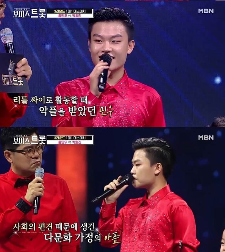 지난 14일 방송된 MBN 예능프로그램 '보이스트롯'에서 황민우는 3라운드 미션인 '1 대 1' 데스매치를 펼쳤다.
