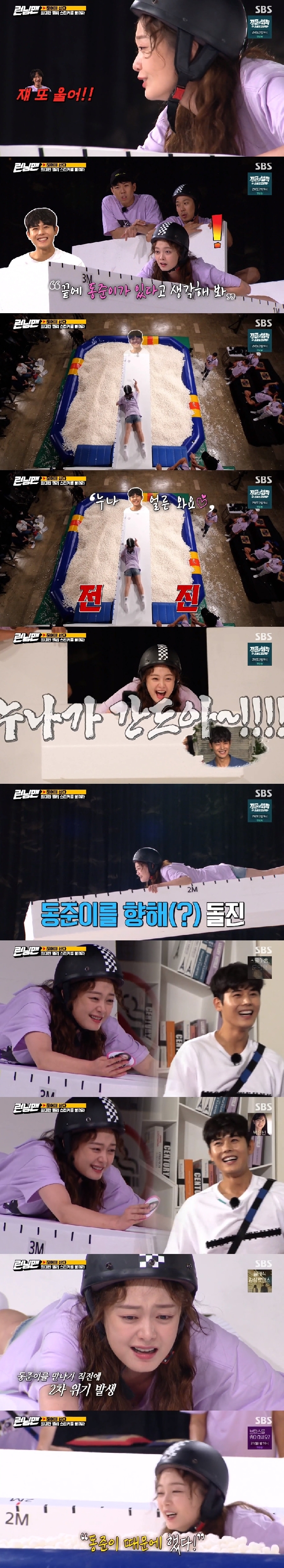 이어 송지효가 가장 멀리 스티커 붙이기에 성공했고, 양세찬은 용기 있게 앞서갔지만 아래로 추락하면서 스티커가 붙지 않아 미션에 실패했다. 그 다음 순서로 전소민이 출격, "오줌 싸면 방송 안 나가냐"고 물으며 두려워 하는 모습을 보였지만, 멤버들이 끝에 김동준이 있다고 생각하라 하자 "동준아 누나가 간다"고 외치며 '사랑의 힘'으로 앞서가는 모습을 보여 웃음을 안겼다. 결국 전소민은 송지효 보다 가장 먼 거리인 330cm 지점에 스티커를 붙이는 데 성공, "동준이 때문에 했다"고 외쳤다.