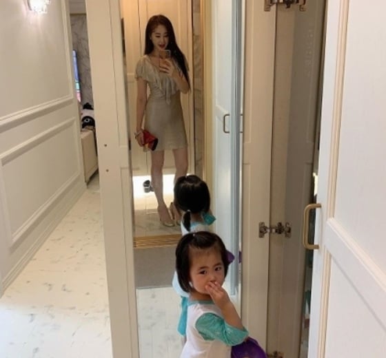 사진 속에는 함소원이 금빛 미니 원피스를 입고 거울 셀카를 찍는 모습이 담겨 있다. 거울 앞에는 함소원과 진화의 딸 혜정 양이 깜찍한 포즈로 서 있다.