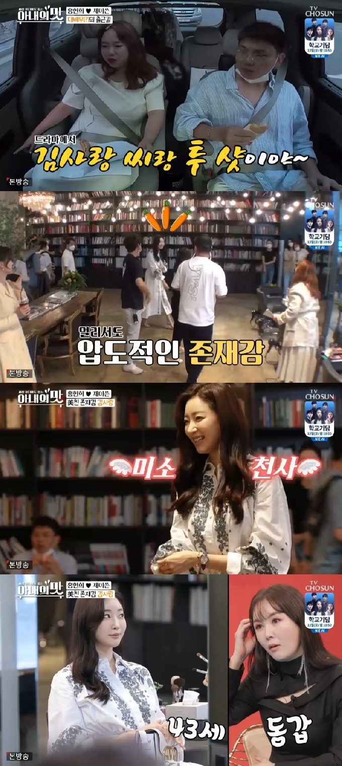 홍현희를 만난 드라마 감독은 김사랑과 연기할 신에 대해 설명했다. 이때 김사랑이 등장하자 '아내의 맛' 남자 출연진들은 "우와~"라며 감탄사를 내뱉었다. 압도적인 존재감을 뽐낸 것. 홍현희는 "제가 떨리더라. 남성 분들은 어떻겠냐"며 공감했다.
