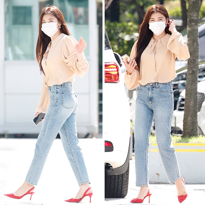 이날 하지원은 살구빛 블라우스에 연청 데님진을 입고 등장했다. 하지원은 발목이 살짝 드러나는 길이의 데님진에 빨간색 슬링백 힐을 매치해 상큼한 분위기를 자아냈다.