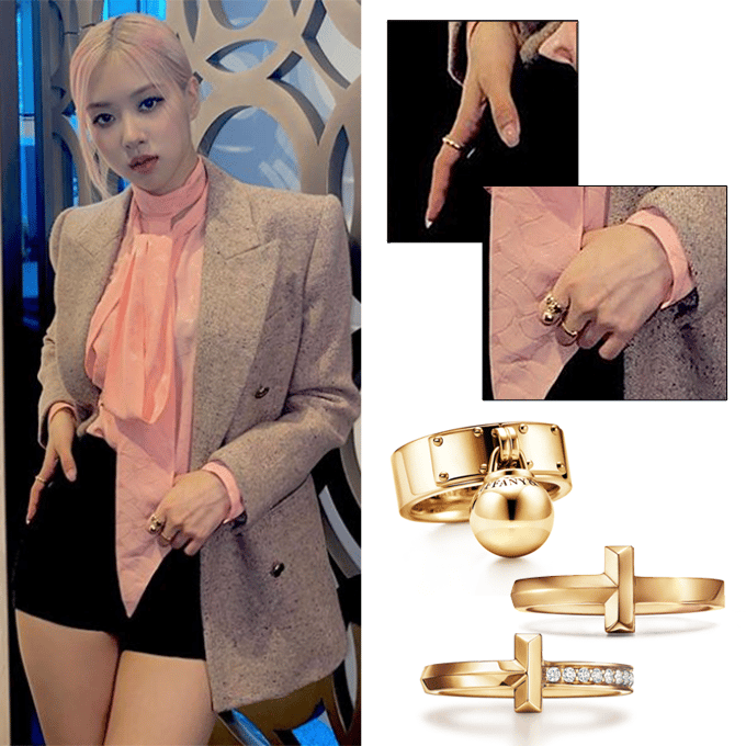 특히 로제는 양손에 다이아몬드가 장식된 옐로 골드 반지를 레이어드해 화려함을 더했다.