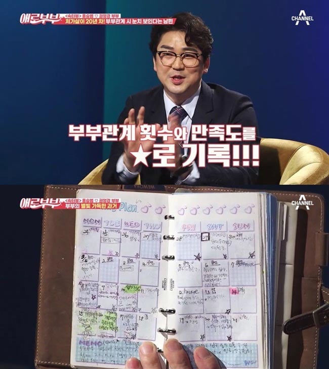 이에 홍승범은 "예전에는 눈만 마주치면 했던 것 같다. 하루에 기억나는 것만 5~6번 정도씩 했다. 그것도 한 시간 반씩. 진짜 과장 아니다"고 말했다. 그러면서 그는 부부관계 후 권영경이 만족도를 표시했던 다이어리를 공개했다. 다이어리에는 커다란 별로 빼곡히 채워져있었다.