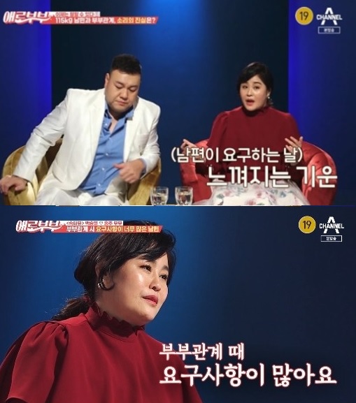 홍주는 "남편이 부부관계를 할 때에 요구사항이 많다"며 남편의 성욕을 감당하기 힘들다고 고백했다. 그는 "(남편이) 자기 만족이 되게끔 자기 스타일에 저를 맞추려고 하는 게 있다"며 "(감당이 힘들어) 잠이 안 와도 자는 척한다"고 말했다.