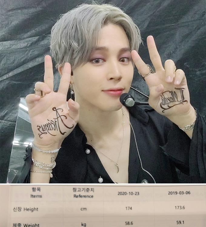 2019년 3월 키 173.6㎝였던 지민은 2020년 10월 0.4㎝가 성장해 174㎝가 됐다. 몸무게는 59.1㎏에서 58.6㎏로 0.5㎏ 줄었다.
