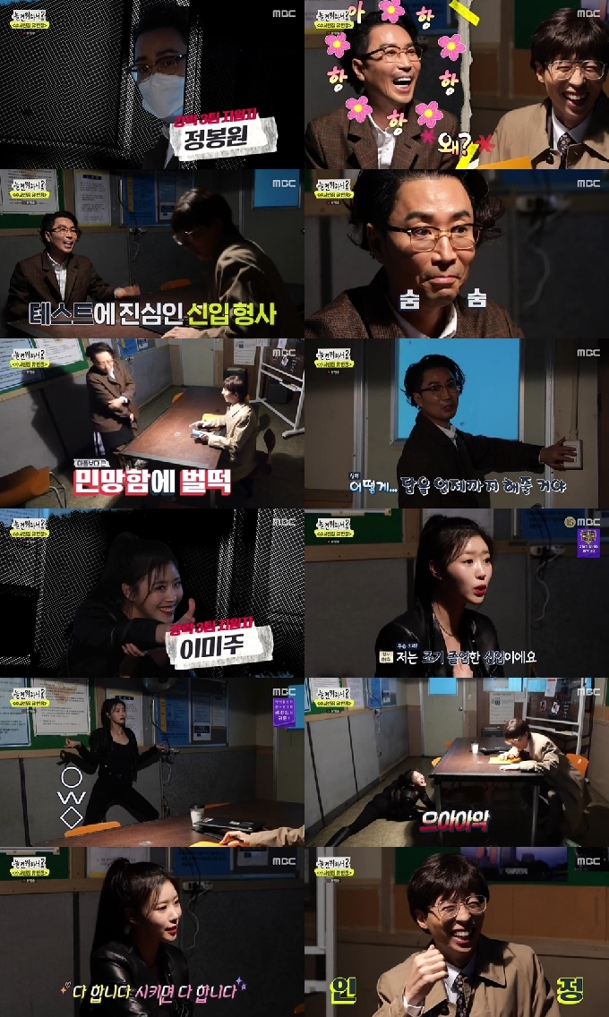 이날 정봉원과 이미주가 신입형사 면접에 나서며 시작부터 빅웃음을 자아냈다. 정봉원은 "날 그렇게 원해? 왜 그럴까?"라고 여유를 부리더니 민첩성 테스트에선 넘어지는 것도 불사하는 승부욕을 불태우거나 "내가 막내 한다. 더럽고 치사해서 견뎌낸다"라고 합격을 갈구하며 질척거리는 모습으로 폭소를 안겼다. 미주는 '수사반장' 음악에 맞춰 뻔뻔함이 돋보이는 댄스를 펼치거나 유연성을 보여준다며 다리찢기를 시도하다 비명을 지르는 사차원 활약을 펼치면서도 "전혀 창피하지 않다"고 강철 멘탈을 뽐내 웃음을 안겼다.