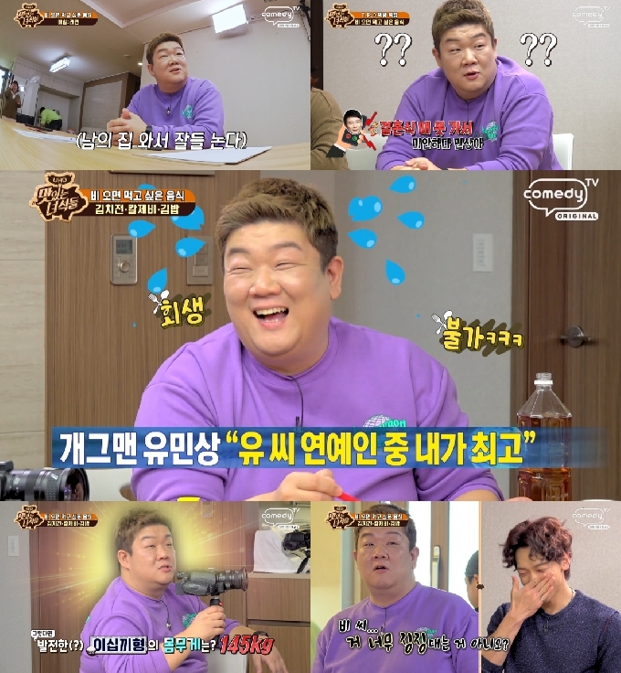 5일 오후 방송된 코미디 TV '맛있는 녀석들'의 '비 오면 먹고 싶은 음식 특집'에서 유민상은 김준현, 김민경, 문세윤, 그리고 월드스타 비와 아이돌 싸이퍼의 탄과 휘를 집으로 초대해 오징어 김치전, 바지락 칼제비, 김밥 먹방을 펼쳤다.