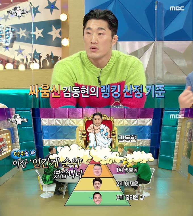 이날 방송에서 김동현은 연예계 싸움 서열을 정리했다. 지난 방송에서 방송인 줄리엔 강이 밝힌 연예계 싸움 서열을 자신만의 순서로 새로 정리한 것. 연예계 싸움 서열을 정리했다.