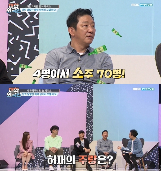 이에 MC 김용만은 허재를 향해 "주량이 얼마나 되냐"고 물었고, 허재는 "많이 먹었을 때는 네 명이서 소주 70병 먹은 적이 있다"고 말해 다시 한번 모두를 기겁하게 만들었다.