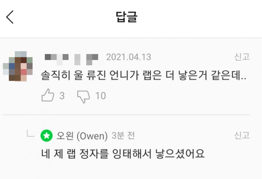 해당 캡처 사진에서 한 누리꾼은 오왼의 새 앨범에 대해 "솔직히 우리 류진 언니가 랩은 더 낳은 거(나은 거) 같은데"라고 하자, 오왼은 "네. 제 랩 정자를 잉태해서 낳으셨어요"라고 댓글을 달았다.