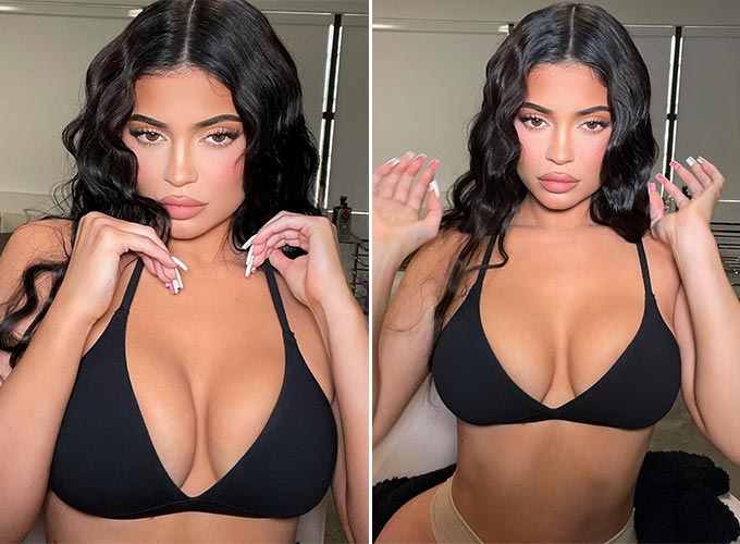 사진 속 카일리 제너는 목 뒤로 감싸는 형태의 블랙 홀터넥 브라 차림에 누드톤 팬티를 입고 포즈를 취했다. 속옷 차림이지만 헤어 스타일링과 메이크업은 모두 완성된 모습이다.