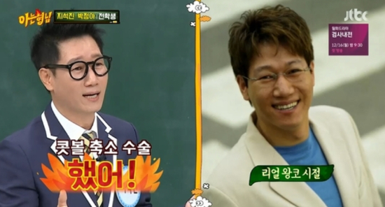 이에 강호동이 "왕코 아니다. 콧볼 축소 수술하지 않았냐"며 "캐릭터를 위해 수술하지 말았어야 했다"고 말했고, 지석진은 성형 사실을 인정하며 "그때도 큰데 더 키울 수는 없지 않냐"고 털어놨다.
