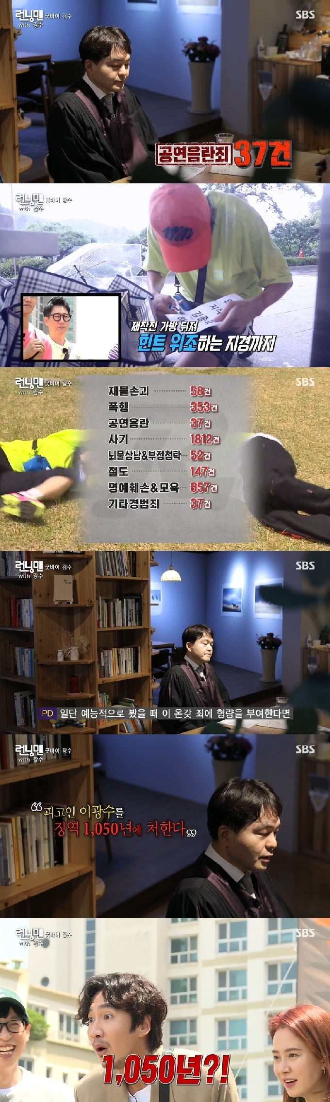 이어 등장한 실제 전직 판사는 이광수의 폭행 350여건, 재물 손괴 58여견, 공연음란죄 37건, 사기 1800여건 등 총 3353건의 악행을 종합적으로 판단, "징역 1050년에 처한다"고 말했다. 이광수는 이 같은 형량에 놀란 표정을 지었다.